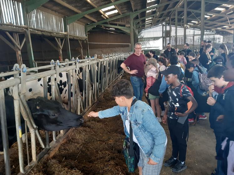 Ça sent la campagne ! » dit un des élèves en arrivant dans la stabulation de Laurent Lambert, et alors que quelques-uns de ses camarades se bouchent le nez. Pas de quoi désarçonner l’éleveur laitier de Jaunay-Marigny, habitué à recevoir des classes. Depuis 2000, il participe en effet chaque année aux Fermes Ouvertes, et sait donc comment présenter de façon ludique son élevage aux scolaires, et leur faire oublier leurs a priori. En leur faisant caresser un veau né la veille, par exemple, ou en leur faisant couler un peu de lait dans la main, directement du pis d’une vache installée dans la salle de traite. Mais aussi avec des éléments plus techniques comme les méthodes d’insémination, la fabrication de l’enrubanné ou le fonctionnement du passeport bovin.