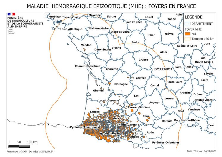 Le nombre de communes de la Vienne qui sont désormais concernées par les mesures de gestion prescrites par la réglementation au regard de l'extension de la Maladie Hémorragique Epizootique (MHE), s'étend désormais 255 communes de la Vienne, et touche maintenant 14 départements du territoire national. Afin d'éviter la diffusion de la maladie et protéger les élevages, une zone dite "régulée " est systématiquement mise en place dans un rayon de 150 km autour de chaque foyer détecté. Liste des communes incluses en zone régulée (visible sur la carte) sur le site de la préfecture.