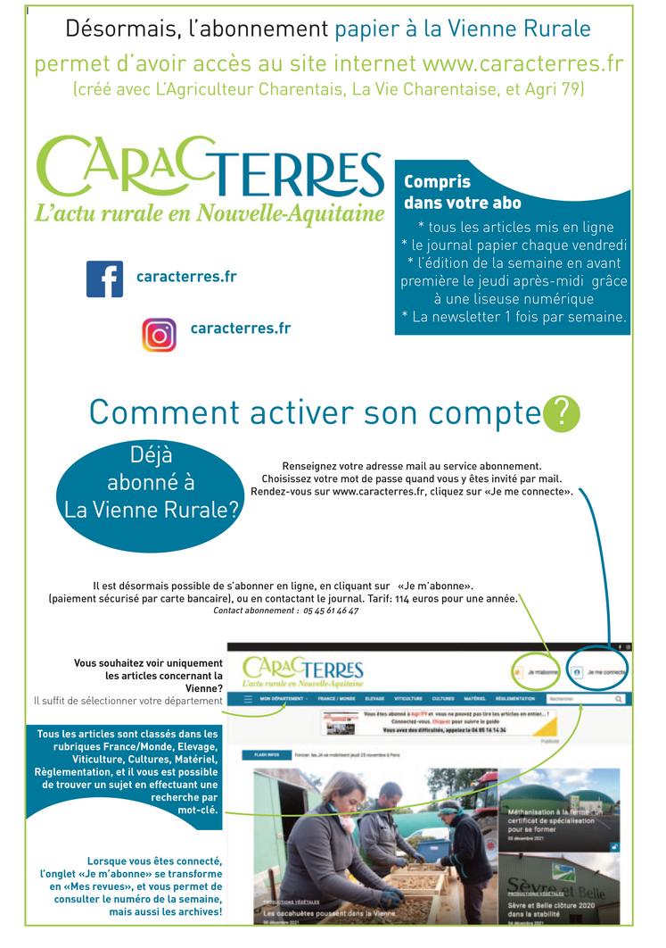 Depuis le mois de janvier, la Vienne Rurale a lancé avec ses confrères de l'ex-Poitou-Charente le site CaracTerres, qui permet à chaque abonné de disposer d'une extension du format papier. Si nous n'avez pas encore activé votre compte en cligne, c'est peut-être parce que le message que nous vous avons envoyé est passé dans les indésirables, ou que vous n'avez pas pu le faire dans les jours qui ont suivi. Mais ce n'est pas grave!