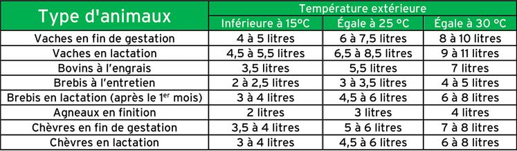 Les animaux souffrent davantage des températures très élevées que du froid. Pour une température de 30 °C, leur besoin en eau double par rapport à l’hiver, pour une même alimentation.