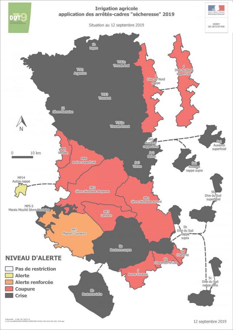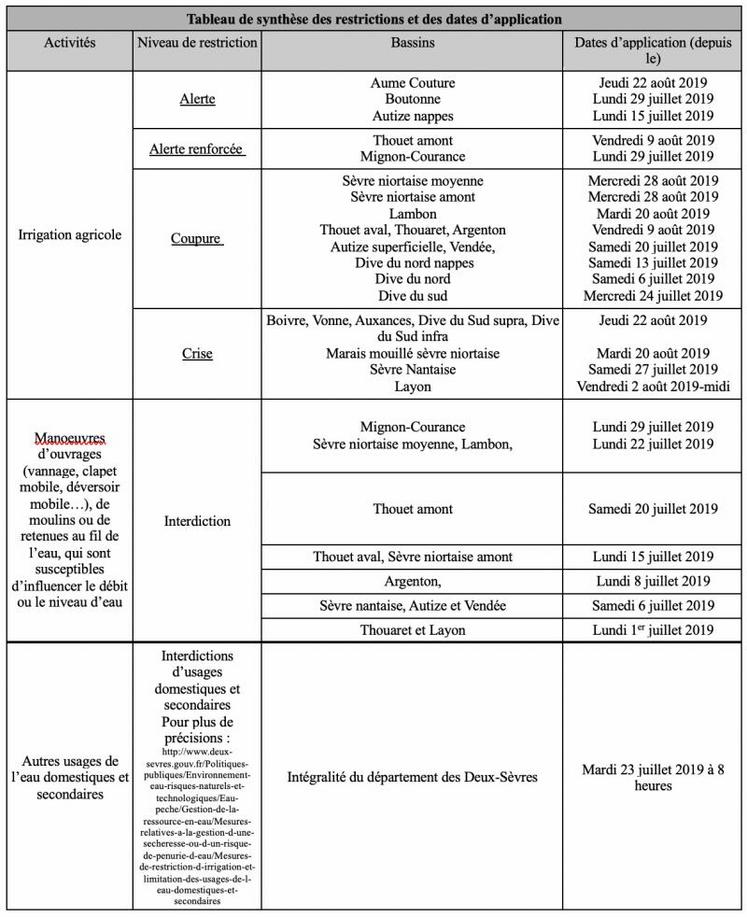 Le tableau ci-joint actualise l'ensemble des mesures en vigueur dans le département des Deux-Sèvres. Elles seront adaptées sur les bassins deux-sévriens, au vu de l'évolution de la situation.