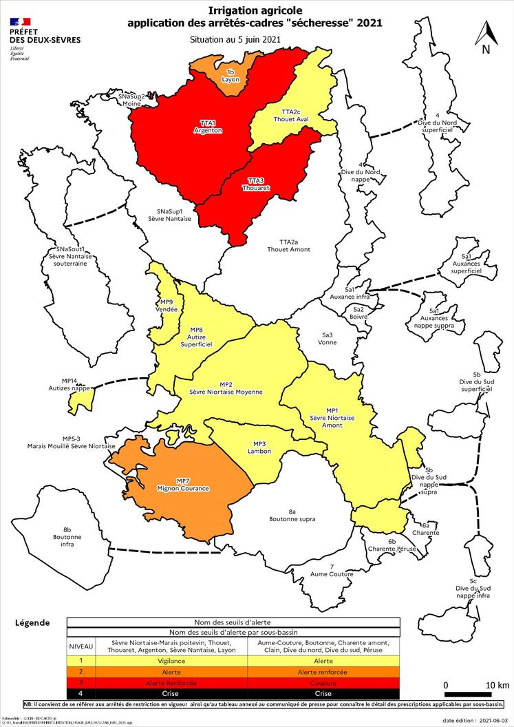 Pour les sous-bassins du Thouaret et de l'Argenton, une mesure d'alerte renforcée (niveau 3) est entrée en vigueur depuis le samedi 5 juin 2021 à 8 heures. Il s'agit d'une mesure d'interdiction de l'irrigation.