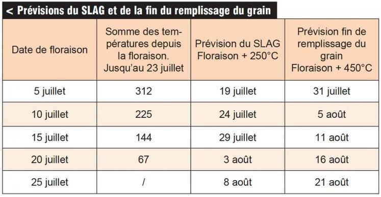 - dès le stade SLAG (probablement vers le 5-10 août), évaluer le nombre de grains espérés/m², pour apprécier le niveau de rendement attendu ;