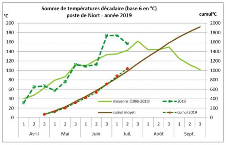 Dans les Deux-Sèvres, la température cumulée depuis le 20 avril a été supérieure de 53 °C par rapport à la moyenne 1986-2018. Cela représente cinq jours d'avance sur la récolte de maïs.