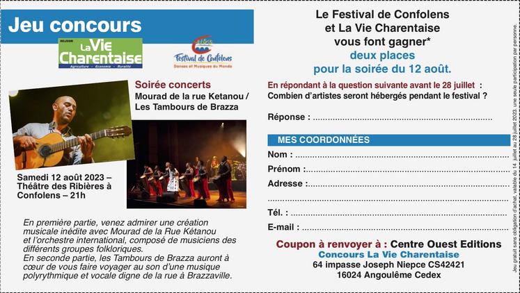 Le Festival de Confolens et La Vie Charentaise vous font gagner des places pour les concerts des samedi 12, dimanche 13 et lundi 14 août. Bulletin à télécharger