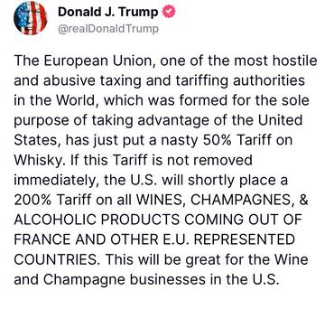 "L'Union européenne, une des autorités les plus hostiles et abusives au monde sur les taxes et les tarifs douaniers, qui a été formée dans le but d'abuser des États-Unis, vient juste d'instaurer une taxe honteuse de 50 % sur le whisky. Si cette taxe n'est pas retirée immédiatement, les États-Unis placeront rapidement une taxe de 200 % sur tous les VINS, CHAMPAGNES & PRODUITS ALCOOLISÉS VENANT DE FRANCE ET DES AUTRES PAYS DE L'UE. Cela sera bon pour les compagnies de vins et de champagne aux États-Unis."