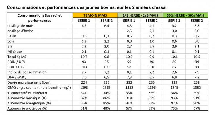 Les rations testées sur les jeunes bovins sont composées d’ensilage de maïs et/ou ensilage d’herbe, complémenté avec du blé et du tourteau de soja ainsi qu’avec de la paille. Trois modalités sont ainsi testées : un lot recevant la ration témoin composée de 100 % d’ensilage de maïs, un lot recevant une ration composée d’1/3 d’ensilage d’herbe et 2/3 d’ensilage de maïs, un dernier lot recevant une ration à base de 50 % d’ensilage d’herbe et 50 % d’ensilage de maïs.