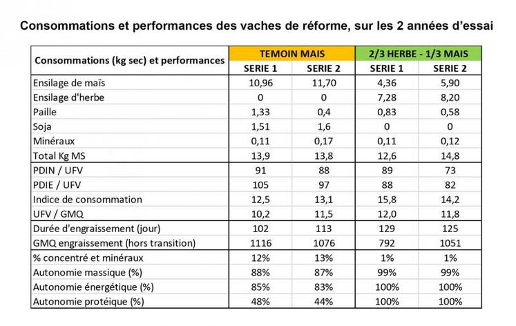 De la même manière, la ration témoin distribuée de façon rationnée aux vaches de réforme était composée d’ensilage de maïs complémenté avec du tourteau de soja et de la paille. Le lot expérimental recevait quant à lui une ration composée de 2/3 d’ensilage d’herbe et 1/3 d’ensilage de maïs, sans correcteur azoté, avec de la paille à disposition.