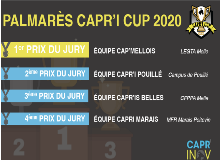Pour sa première édition du Capr’I Cup, le challenge caprin des établissements d’enseignement agricole, cinq épreuves étaient prévues, dont quatre lors de Capr’Inov. La crise sanitaire ayant rebattu les cartes, ce sont finalement autour de quatre épreuves et à distance que les équipes participantes se sont affrontées. Lors du Capr’I Cup Team, les élèves ont du faire preuve de créativité et d’originalité afin de réaliser un blason représentant leur école. Un quiz de culture générale sur la filière caprine était ensuite proposé avec le Capr’I Cup quiz. L’épreuve, qui s’est déroulée en équipe et en ligne, a mobilisé les connaissances théoriques de chacun.