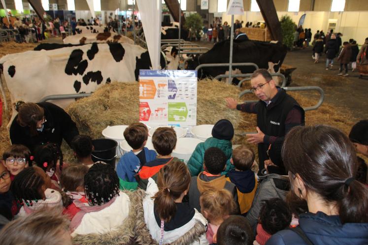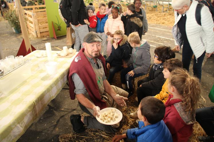 Dès le jeudi matin, c’était l’effervescence dans le Parc des expositions. Cette première journée de la Ferme s’Invite était placée sour le signe des visites scolaires. 970 élèves (du CP au CM2, ainsi que des 6e de Segpa) d’écoles de Grand Poitiers ont suivi le parcours pédagogique d’une cinquantaine d’animations proposé par la FNSEA 86, partenaire du salon. Les différents pôles (bovins, ovins, caprins, céréales, lait..). ont permis aux enfants de rencontrer des agriculteurs et des jeunes en formation agricole pour parler de leurs métiers et de leur passion. «C’est important de leur expliquer à quoi sert l’agriculture. On n’a pas si souvent l’occasion de le faire», explique Sébastien Taillefer, vice-président de la FNSEA. Ce matin-là, les écoliers joignent l’utile à l’agréable en dégustant du fromage de chèvres, après avoir découvert ce que mangent les vaches. Plaisir ultime, ils viennent caresser un chevreau, après avoir appris auprès du GDS que les animaux de ferme ont eux aussi leur carte d’identité. Evidement cette visite sert de support pédagogique aux enseignants. «Les élèves voient quels produits sont tranformés avant de pouvoir être mangés, et de quoi se nourissent les bêtes. Les enfants ne savent pas toujours quels sont les noms des bébés des animaux», confie Catherine Sénéchal, professeure des écoles, à l’école J-Y Cousteau à Vouneuil sous Biard.