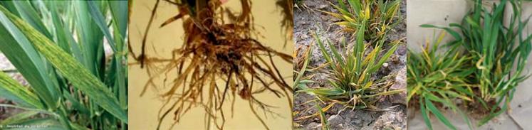 Le piétin échaudage est un champignon du sol qui, dans un premier temps, attaque les racines. En sortie d’hiver, les plantes présentent une faible croissance associée à un mauvais tallage. Les feuilles jaunissent parfois par la pointe. Cependant, pour confirmer le diagnostic, il faut prélever les plantes les plus touchées avec leurs racines, puis laver soigneusement les racines. Les plantes présentent généralement quelques racines nécrosées, partiellement ou en totalité. La présence de piétin échaudage peut se limiter à la présence de quelques taches noires ou brunes. La comparaison avec les racines de plantes saines confirme l’observation. Avec l’automne très doux et humide, on peut s’attendre à l’observation de ces symptômes, même si le décalage de semis des céréales est un facteur défavorisant.