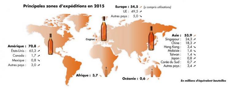 Selon les derniers chiffres du BNIC, à fin juin, les sorties s’élevaient à 527 712 hl AP dont 475 738 vers les marchés étrangers (+6,6 %) et 10 608 sur le marché français (-8%). les expéditions fin juin ét aient en hausse sur l’année de 6,3 % (-8%). depuis le début d ela campagne, les expéditions ont cru de 6,1 % (marchés étrangers de 6,5 %, marché français -11,5 %). A la fin 2015, année civile, cela représentait 82,73 millions de bouteilles en VS et *** et 86,14 millions de bouteilles en qualités supérieures. Soit 168 M de bouteilles. Aujourd’hui le marché des Etats-Unis est à
