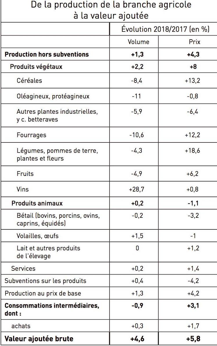 Selon les derniers chiffres de l'Insee, l'année 2018 a été marquée par des récoltes souvent en berne, la faute d'un printemps pluvieux et d'une sécheresse estivale. Pour compenser, les prix étaient globalement en rebond.