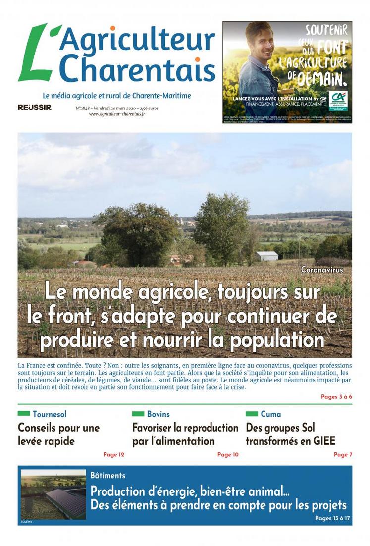 L’arrivée du Covid-19 bouleverse les habitudes de chacun, notre rythme de travail, les relations avec les autres. Les rendez-vous techniques, ou bien avec les agriculteurs, les assemblées générales... Tout ce qui fait l’essence même du contenu de votre hebdomadaire agricole va se trouver modifié. Cette semaine, nous gardons la même pagination, avec un contenu toujours au plus près des préoccupations de nos abonnés. Certes, en tant qu’entreprise de presse, nous avons la liberté de circuler pour vous tenir informés, mais nous sommes aussi soucieux de votre santé, de la nôtre et de celle de nos proches. À partir de la semaine prochaine, L’Agriculteur Charentais sera quelque peu remanié. Nous vous proposerons une édition avec certains changements, mais en essayant de toujours répondre à vos attentes. Nous travaillons aussi avec une imprimerie et avec la Poste. Si l’un des maillons manque, il sera difficile pour nous de continuer, le temps que durera cet épisode sanitaire.