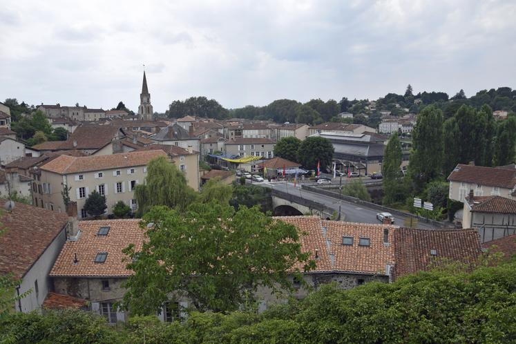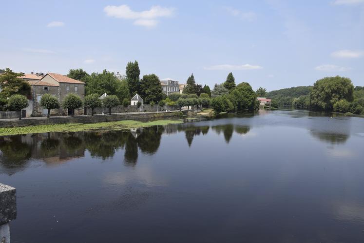 Square Jules-Halgand. C’est toujours le point de départ de la visite de Confolens. D’abord, parce que le nom de la ville vient de là : à cet endroit où le Goire rencontre la Vienne, c’est la confluence des deux rivières. Ensuite parce que la commune entretient un rapport étroit avec l’eau et les rivières. La Vienne a l’air calme en apparence, mais elle peut devenir tumultueuse. Avec son fond plat, elle peut monter très vite. Lors d’une crue historique de 1944, elle avait débordé de 5 mètres 30. L’actuelle place Henri-Coursaget (entre les halles et l’hôtel de ville) était inondée à moitié.