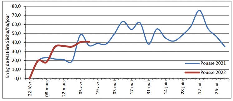 Actuellement, la pousse est à 40 kg MS/ha/j. Avec ce chargement, il faut consacrer autour de 40 ares/UGB pour couvrir les besoins des animaux en herbe. Un chargement plus élevé ne couvrira pas les besoins et pénalisera la repousse de la prairie par le surpâturage.
