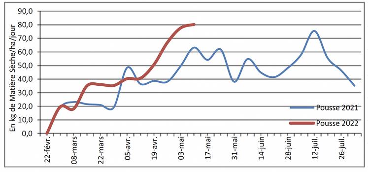 Partout où l’eau ne fait pas défaut, l’herbe pousse bien, en quantité comme en qualité . Dans de nombreuses situations, les animaux ont du mal à venir à bout de la pousse. Pour éviter de perdre du fourrage, il est judicieux de « débrayer » une partie des parcelles de pâturage pour réaliser une fauche. Les prochaines températures élevées pour la saison, associées au manque d’eau déjà ressenti, auront pour effet de diminuer, voire de stopper la croissance de l’herbe.