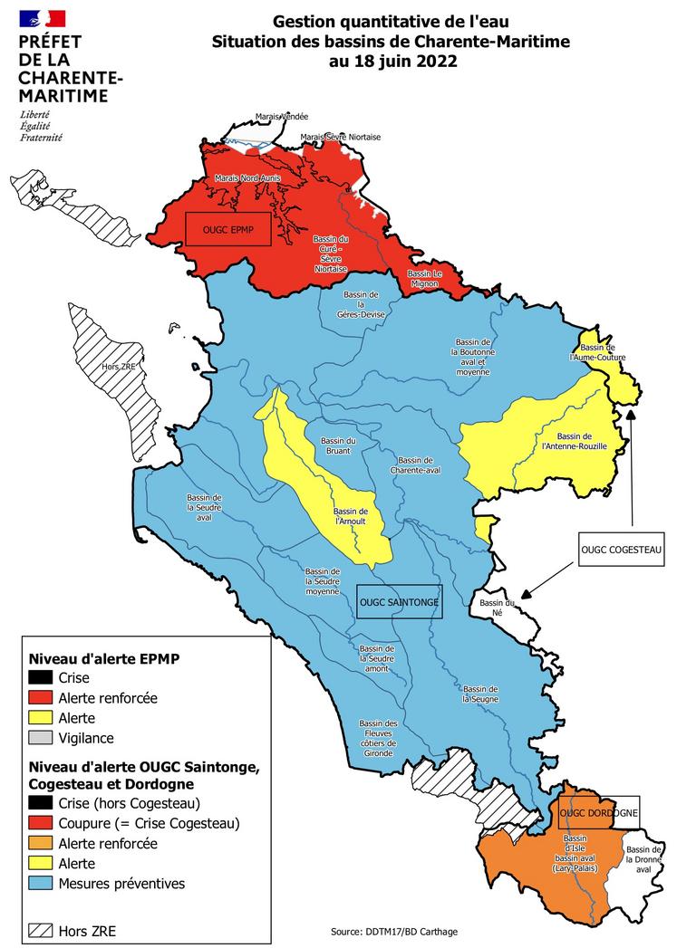 Bassin Seudre amont, aval et moyenne (OUGC Saintonge) : Hors alerte. Mesures préventives : prélèvements à usage d'irrigation (Arrêté du 14/06/2022)autorisés de 19h à 12h.