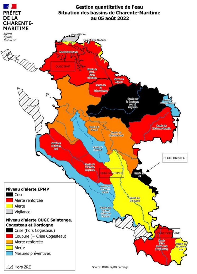 Compte tenu de l’état de la ressource en eau, le préfet de la Charente-Maritime prend les mesures de limitation des usages de l’eau suivantes :