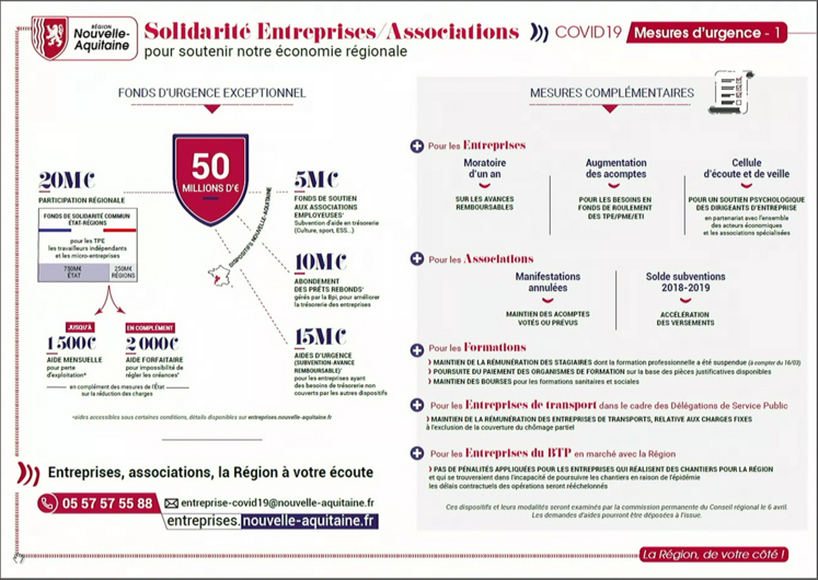 Pour toute question, un numéro de téléphone est ouvert depuis le début de semaine : il s'agit du 05 57 57 55 88. Les experts sont également disponibles par mail à entreprise-covid19@nouvelle-aquitaine.fr. Toutes les informations actualisées sont disponibles sur le site entreprises.nouvelle-aquitaine.fr