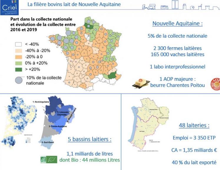 Le centre régional interprofessionnel de l'économie laitière (Criel) de Nouvelle-Aquitaine a tenu son assemblée générale. Dans la région, la filière bovins lait pèse pour 5 % de la production nationale, autour de cinq bassins laitiers. Les deux principaux restent les Deux-Sèvres et les Pyrénées-Atlantiques. Le bio représente 44 millions de litres, 4 % de la production nationale à 1,1 milliard de litres. Le lait est transformé dans l'une des 45 laiteries du terroir. L'étude de FranceAgriMer montre également que la région importe du lait d'autres régions dans ses laiteries. Une situation qui s'est inversée par rapport à 2010.