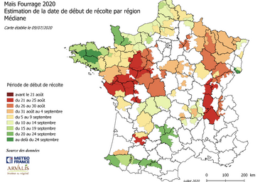 Arvalis - Institut du végétal propose la carte des dates prévisionnelles de début des récoltes des maïs…