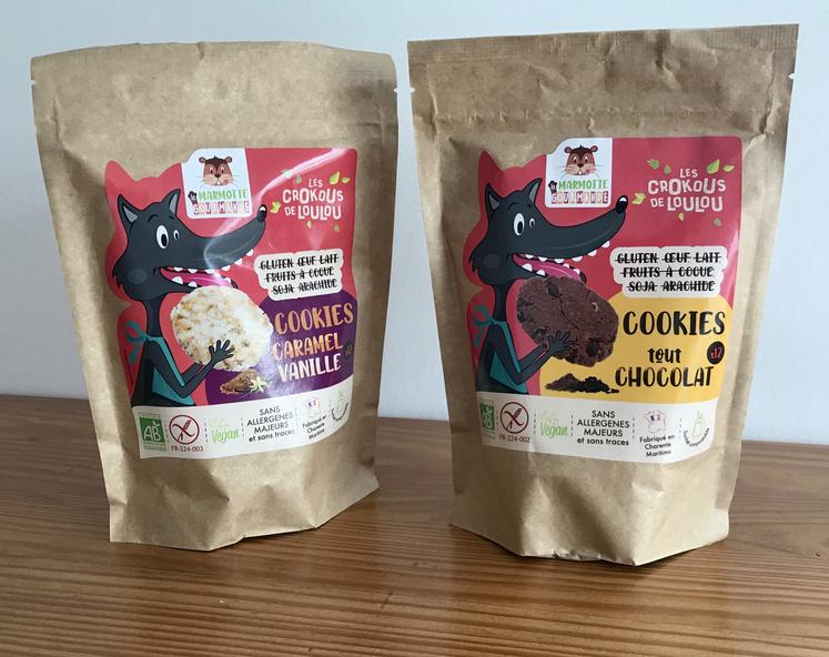 Avant de mettre la main à la pâte, la biscuitière a effectué une recherche bibliographique pour choisir ses ingrédients. « J’ai remplacé la farine de blé par de la farine de riz, de l’amidon de maïs et de la fécule de manioc », détaille-t-elle. Il ne lui restait plus qu’à trouver le bon dosage et d’y incorporer une matière grasse. « J’ai essayé plusieurs huiles et ma préférée est l’huile de coco ». Une centaine de tests de recettes plus tard, les cookies de la Marmotte Gourmande sont nés ! La pâtissière les a déclinés en deux gammes : les Crokous de Loulou, aux notes chocolatées et caramélisées, et les Foliz de Moumise, plus fruitées.