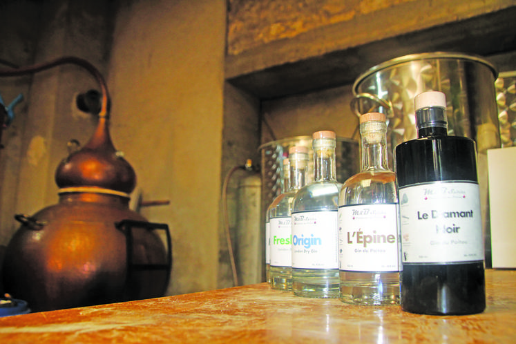 En attendant de pouvoir commercialiser ce whisky, Morgan Rochais et Boris Thévenet ont eu envie de commencer à faire exister leur marque, en se lançant dans la fabrication de gins et spiritueux. « On a voulu aller vers le local » redit Boris Thévenet en désignant la bouteille de gin à la truffe. Le « Diamant noir » est réalisé avec une base de distillat de blé, dans laquelle des truffes, des Deux-Sèvres, sont mises à macérer avant distillation, et également après, et dans laquelle sont aussi ajoutées de la vanille et de la muscade. « C’est un mélange très subtil, mais qui a nécessité de nombreux tests. La truffe est un arôme très volatil, et il a fallu travailler pour qu’il reste, et que ce ne soit pas non plus écœurant...». Autre travail avec un produit local: l’épine. « Les pousses d’épine ont été ramassées par une connaissance, qui fabrique de l’épine depuis des années, en Vendée ». Près de 5kg d’épine ont été mises à macérer pendant trois semaines, fin avril, et sont désormais distillés, au fur et à mesure des besoins. Comme pour la truffe, de nombreux tests ont été réalisés avant de trouver un mélange idéal, qui comprend aussi des baies de genièvre et de la vanille. « Ce qui nous a surpris, c’est de nous rendre compte, après coup, qu’en allongeant ce gin avec un tonic, on arrive à une boisson qui rappelle vraiment l’épine qu’on boit à l’apéritif...» Contrairement au whisky, pour lequel il faudra encore attendre un an avant de déguster, M&B propose déjà 4 gins et un spiritueux, qui peuvent être achetés via le site internet*, et qui sont également disponibles chez des restaurateurs de la Vienne, à Niort, La Rochelle, Tours, ou en Vendée. « Ce qu’on veut, c’est étoffer la gamme. Et j’ai plein d’idées!» sourit Boris Thévenet. Toujours dans leur optique de privilégier le local, les associés aimeraient trouver un producteur d’orge dans la Vienne, pour faire malter ses grains. « On aimerait aussi trouver de la citronnelle locale». L’appel est lancé! *http://www.distilleriedupoitou.com/