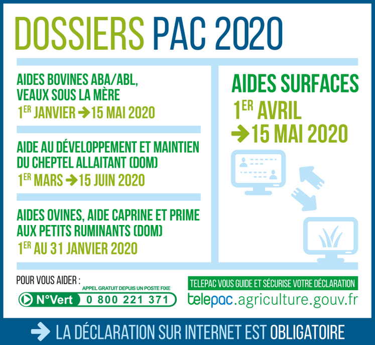 Toute exploitation ayant connu une modification depuis la dernière campagne Pac, soit depuis le 15 mai 2019, doit compléter le formulaire utilisable tout au long de l’année « déclaration des modifications intervenues au sein d’une exploitation, Campagne 2020 ». Pour que ces modifications soient prises en compte pour la prochaine déclaration Pac, ces changements doivent impérativement être signalés à la DDT(M) du département du siège d’exploitation, au plus tard le 15 mai. Le formulaire est disponible sur le site Télépac, dans les onglets supérieurs avant identification.