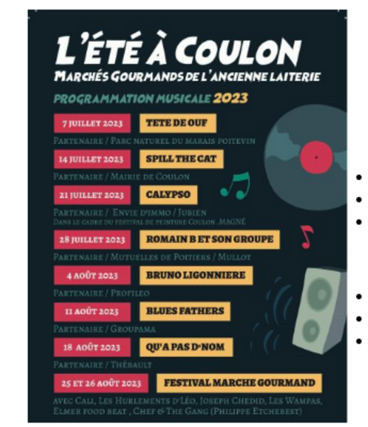 Tous les vendredis soirs de l'été, Coulon, la Venise verte du Marais Poitevin donne rendez-vous aux amateurs de bons produits locaux et... de musique.