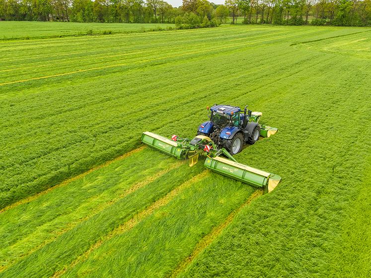 Le regroupage des andains au moment de la fauche permet de gagner du temps en dispensant de l’étape d’andainage. Il présente aussi l’intérêt d’éviter de perdre les feuilles de fourrages fragiles et limite la montée de pierres ou de terre dans la récolte. En revanche, le recours à cette technique avec un gros volume de végétation ne favorise pas le séchage de l’herbe, en limitant la surface exposée au soleil. Les différentes solutions embarquées sur les faucheuses pour regrouper les andains ne donnent pas les mêmes résultats et le choix est généralement dicté par la largeur du pick-up de la machine de récolte. Les longs volets déflecteurs constituent le dispositif le plus économique. Ils ne sont disponibles que sur les machines traînées équipées d’un conditionneur. Leur seule action consiste à guider le flux de matière expulsé par le rotor. Celui-ci reçoit parfois des fléaux spécifiques, pleins chez Krone par exemple, pour accroître la ventilation et donc la distance de projection. Ces déflecteurs rapprochent les andains de deux passages successifs sur des largeurs allant de 3 à 4,5 m, selon les marques. Ils sont ainsi compatibles avec des ensileuses pourvues d’un ramasseur large.