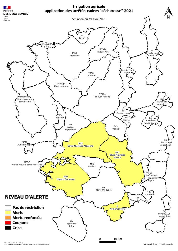 La pluviométrie très faible, couplée au redémarrage de la végétation, a fait baisser le niveau des nappes et le débit des rivières. À compter du lundi 19 avril, 8 heures, la Préfecture a décidé de mettre en œuvre des mesures de restriction des usages de l’eau, à destination de l’irrigation agricole, dans les sous-bassins de la Sèvre Niortaise moyenne (MP2) et de la Sèvre Niortaise amont (MP1).