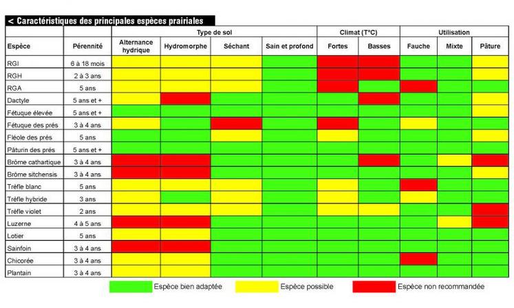 Les associations ray-grass anglais - trèfle blanc et ray-grass hybride - trèfle violet sont très bien adaptées pour une valorisation respectivement en pâturage et en fauche (ou mixte) dans des secteurs géographiques ne souffrant pas de déficit hydrique. La sécurisation de la production d’herbe impose de rechercher de la diversité dans les espèces semées dans les différentes parcelles de l’exploitation (prairies dédiées à la pâture, prairies précoces pour engager la mise à l’herbe et fauchées ensuite, légumineuses de fauche…) mais aussi de la diversité dans la composition de chacune de ces prairies (prairies multispécifiques). Plus le contexte de sol est difficile et plus le risque d’aléa climatique est élevé, plus la prairie multispécifique apportera de plus-value.