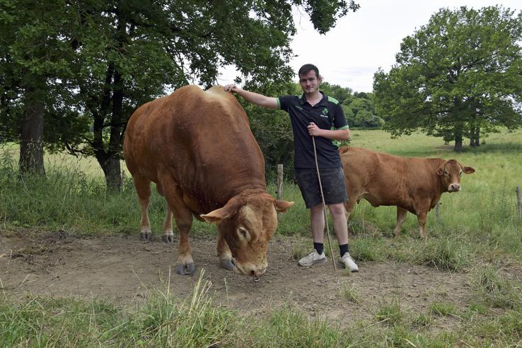 Thibault Laloi n’a pas 20 ans. Mais il a développé la passion de l’élevage auprès de sa famille. Il suit les traces de son père Christian et de sa tante Michèle, qui tiennent les rênes de l’exploitation familiale de 250 hectares à Massignac depuis 1996. « Nous comptons 400 têtes de bétail, avec 170 vêlages annuels ». Les animaux sont abattus à Chalais et à Confolens, et leur viande est distribuée dans les magasins Super U de ces secteurs. « Nous sommes presque en autonomie complète de foin. En paille, nous avons 32 hectares de céréales que l’on garde pour nos vaches pour pailler l’hiver et l’autoconsommation. Nous faisons aussi 16 à 17 hectares de maïs pour l’ensilage des vaches reproductrices. Les vaches sont en ration sèche. Nous n’achetons que de la luzerne pour les vaches d’engraissement et de concours ».