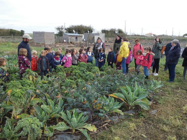 Ambiance classe verte en ce mercredi matin sur le Gaec Au potager de la Jarne. Pierre Bouteiller, maraîcher-apiculteur, accueillait une vingtaine d’enfants de six-sept ans pour leur présenter la culture des légumes d’automne. Ce sont d’abord les animaux présents sur l’exploitation - poules pondeuses et canards - qui ont retenu l’attention de la jeune troupe, mais, une fois dans les rangs où sont présentes de multiples variétés de choux, les légumes parviennent à les captiver. Ils répondent facilement aux questions sur l’identification des légumes, et n’hésitent pas à en poser eux-mêmes quelques-unes. « Est-ce qu’il y aura aussi des carottes ? », demande ainsi un petit garçon au maraîcher qui explique qu’il va planter des pommes de terre sur une parcelle qui accueillait cette année des patates douces...