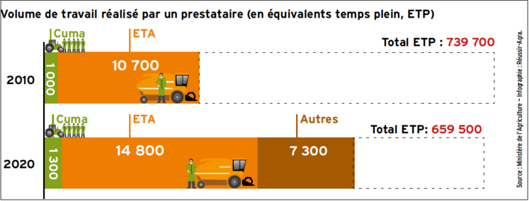 À l’occasion d’une conférence de presse le 8 juillet, le service de statistique du ministère de l’agriculture a détaillé les chiffres du recensement agricole 2020, notamment la partie dédiée à l’emploi. Si elles ne représentent encore qu’une part marginale des emplois en agriculture (2,2 % des équivalents temps plein), les entreprises de travaux agricoles (ETA) ont vu leur volume de travail progresser de 40 % entre 2010 et 2020.