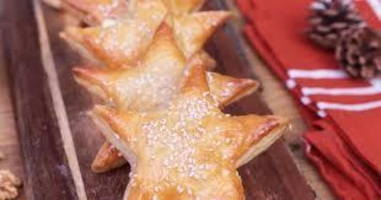 Déroulez les pâtes feuilletées, découpez-les en forme d'étoile et badigeonnez de jaune d'œuf. Au centre de l'étoile, déposez les cubes de fromage, les noix préalablement concassées et assaisonnez. Recouvrez d'une autre étoile. Soudez les bords.