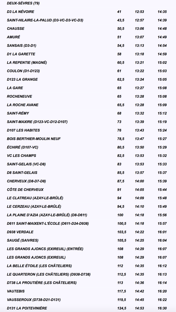 Durant cette étape, le département sera coupé en deux parties pendant 4 heures environ. Les échanges entre le nord et le sud ne pourront se faire qu’en utilisant la route départementale 743 Niort-Parthenay ou le réseau autoroutier A 10 et A 83.
