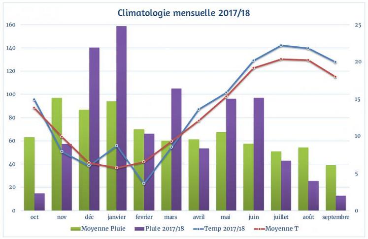 Le millésime 2018 se termine par un été sec et chaud avec 1.8°C de plus que la moyenne sur les 3 mois Juillet, Août et Septembre et une pluviométrie déficitaire de 63mm. La sécheresse se fait sentir, notamment dans les vignobles jeunes ou avec un enracinement peu profond.