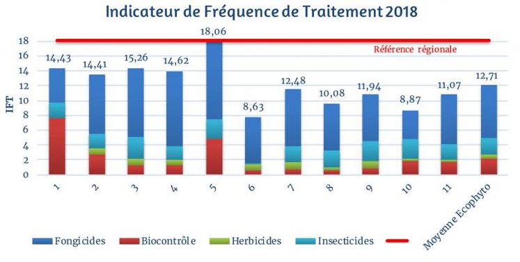 En 2018, l’IFT obtenu en moyenne sur les fermes DEPHY Ecophyto est de 12.71, dont 0.56 points d’herbicides, 2.13 points d’insecticides (lutte obligatoire contre le flavescence dorée) et 2.12 points de produits de biocontrôle*.