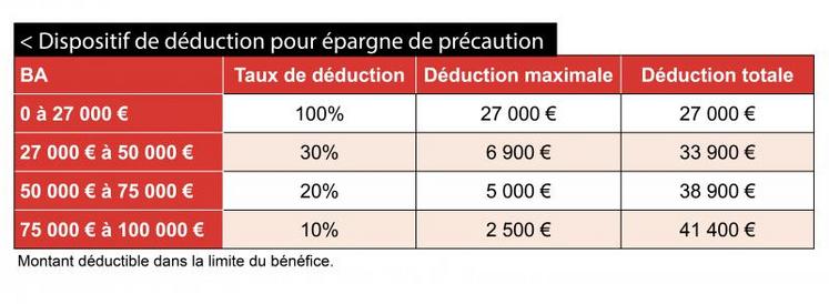 Ce dispositif, qui rentre dans les minimis, est plafonné à 150 000 EUR de déduction, en épargne de précaution, sur dix ans glissants. Ce plafond est multiplié par le nombre d'associés exploitants dans les Gaec et EARL, dans la limite de quatre.