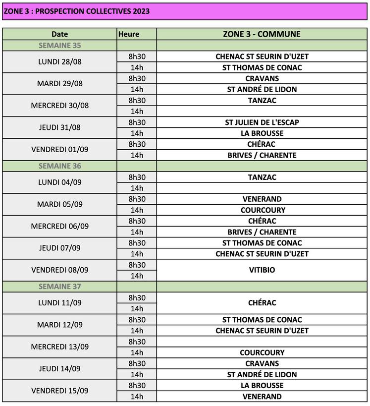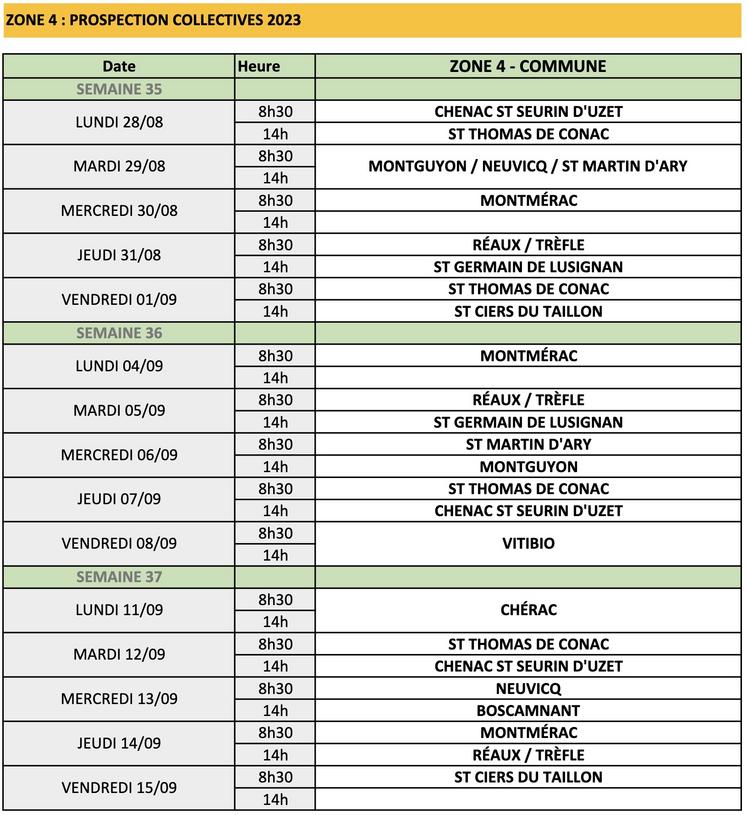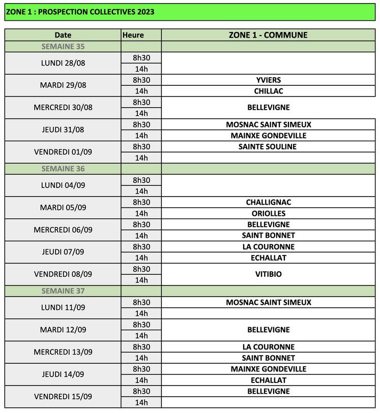 Les prospections collectives contre la flavescence dorée ont débuté ce lundi 28 août. Quatre zones ont été déterminées pour cette année. Les animateurs à contacter sont Benjamin Hirondeau (06 14 09 20 78) pour la zone 1, Mélissa Gecchele (06 36 47 76 04) pour la zone 2, Laurent Lépine (06 70 57 09 82) pour la zone 3 et Céline Mathieu (07 88 47 27 90) pour la zone 4.