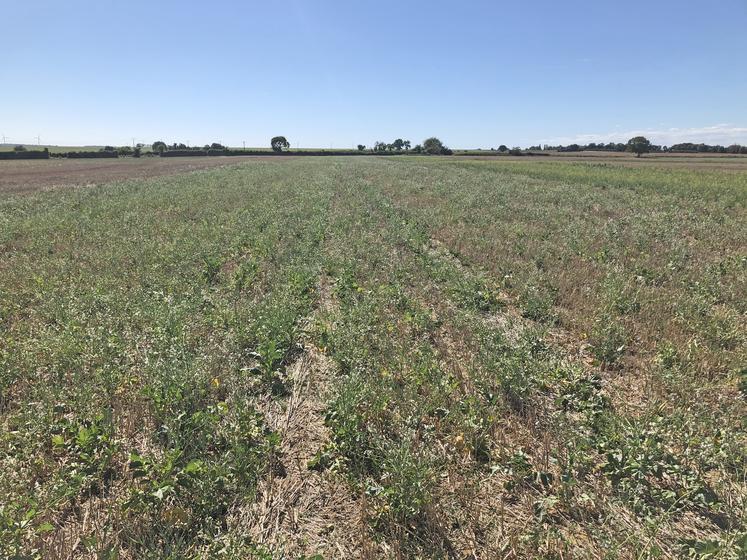 La moisson, le pressage et l’export de la paille de la parcelle reportent les semis à la fin juillet, plus un délai de deux à trois semaines avant germination. « Pour gagner du temps à l’implantation, nous avons choisi d’expérimenter le semis dans des céréales à paille, avant récolte ». Deux exploitations se prêtent au jeu, à Sainte-Eanne et Souvigné, sur 6 ha.