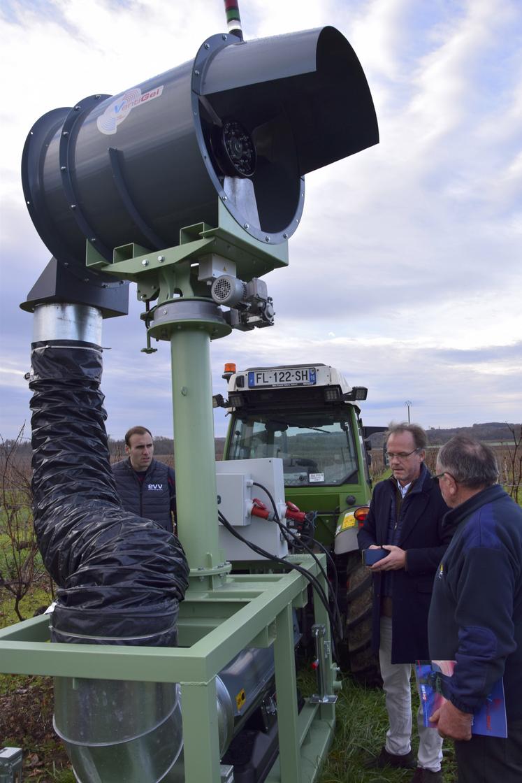 La société Setag (Le Haillan, Gironde) a mis au point le système Ventigel. Vincent Jourzac, responsable commercial, décrit le ventilateur électrique, associé à un chauffage fioul : « Le principe est d’assécher la végétation, car les plantes sèches résistent mieux au gel. Notre système innove en apportant en plus des calories grâce à un chauffage industriel à 100 °C, avec 8 °C à la sortie du ventilateur ».