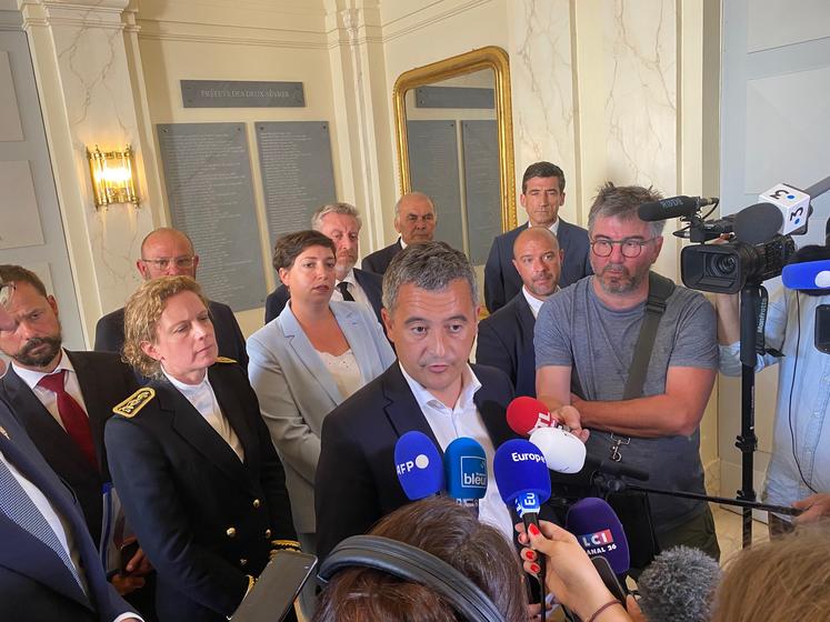 En amont du Village de l'eau, organisé du 16 au 21 juillet à Melle par les opposants aux réserves de substitution, le ministre de l'intérieur Gérald Darmanin s'est déplacé à la préfecture des Deux-Sèvres, lundi 15 juillet, pour une concertation avec les élus du territoire sur le dispositif de sécurité mis en place pour l'occasion.