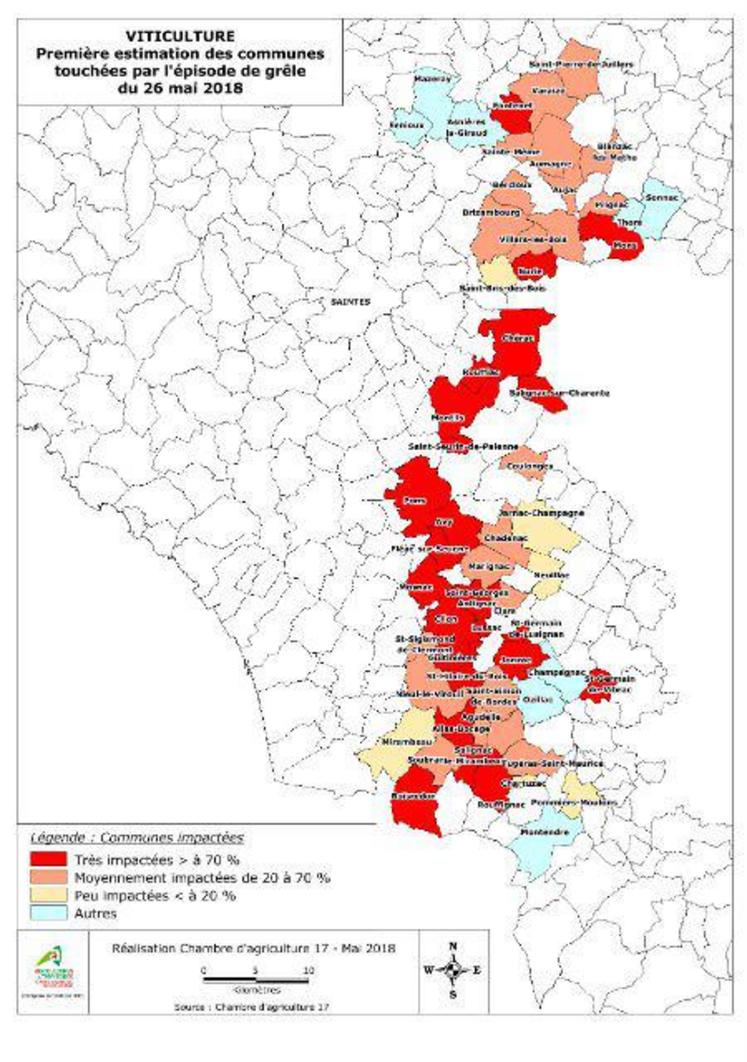 La chambre d’agriculture a présenté une estimation des dégâts. A ce jour, 176 exploitants agricoles se sont déclarés auprès de cette instance. «Les premières estimations s’élèvent à 10.000 hectares de vignes et plus de 30.000 hectares de grandes cultures touchés. Par ailleurs, 120 communes ont répondu au questionnaire de la DDTM : les vignes de 42 communes ont été impactées à 65% en moyenne. 41 communes ont vu leurs grandes cultures détruites à 62%.» On devrait dans les prochaines semaines affiner cette première constatation.