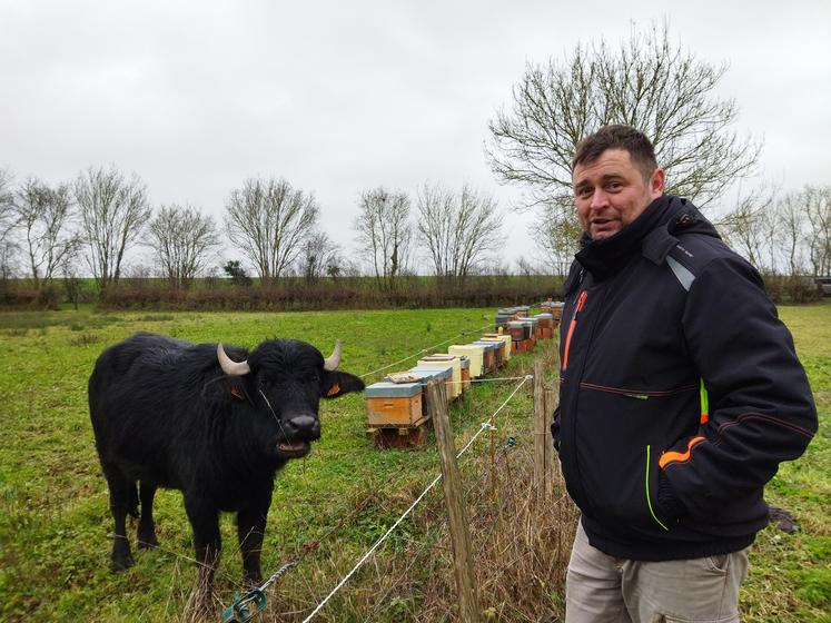 Apiculteur à titre principal depuis 2022, Quentin Deschamps compte 170 ruches au cœur du Marais poitevin, à Arçais. Et deux bufflonnes garantes du bon entretien du milieu. « Parmi les 3,5 ha sur lesquels je place mes ruches, plusieurs parcelles sont difficiles à entretenir mécaniquement : des peupleraies, des terrains peu portants, ou difficiles d’accès ». D’où l’idée de l’agriculteur de faire intervenir le buffle, animal qu’il a connu lors de déplacements professionnels en Amérique du Sud et en Asie.