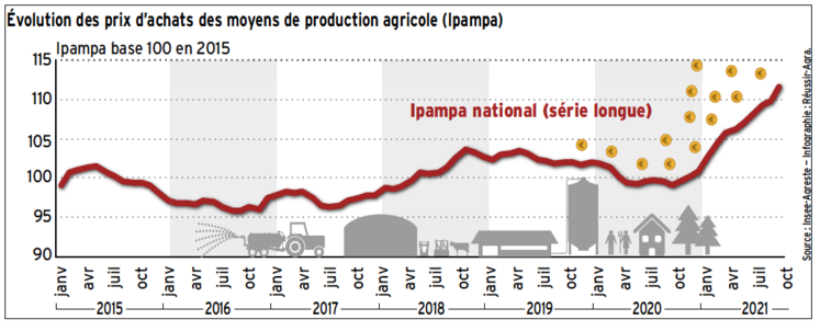 Mesurée par l’indice de prix d’achat des moyens de production agricole (Ipampa), l’inflation des prix des intrants agricoles s’est accélérée en septembre, rapporte le service de statistique du ministère de l’agriculture. La hausse est de 12,6 % par rapport à septembre 2020 (après +10,2 % en août). Comme les mois précédents, notent les analystes, « ce sont les prix des engrais et ceux de l’énergie qui augmentent le plus fortement sur un an, avec respectivement +39,7 % et +29,5 % ».