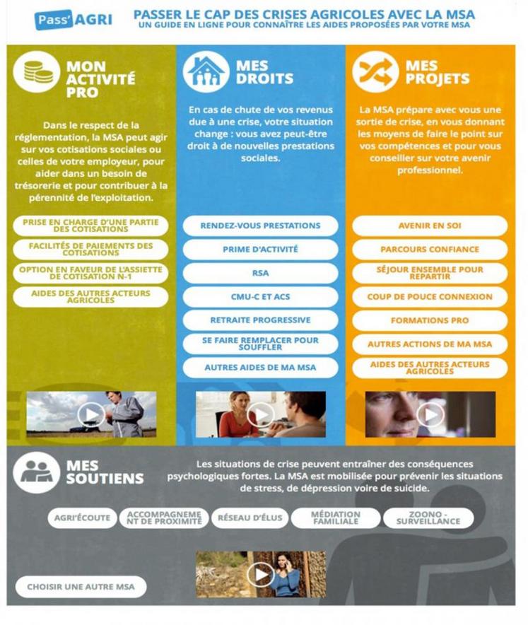 Accessible à tout moment et régulièrement actualisé, Pass’Agri recense les dispositifs financiers proposés par la MSA, ses réseaux de soutien, les prestations sociales accessibles en cas de baisse de revenus et les solutions possibles pour réfléchir à son avenir professionnel. Le guide présente l’ensemble des aides MSA. Il suffit simplement à l’agriculteur de se connecter sur le site de la MSA, à la rubrique exploitant/ soutien aux agriculteurs, ou d’y accéder, via un navigateur internet, en tapant msa.fr/pass-agri.