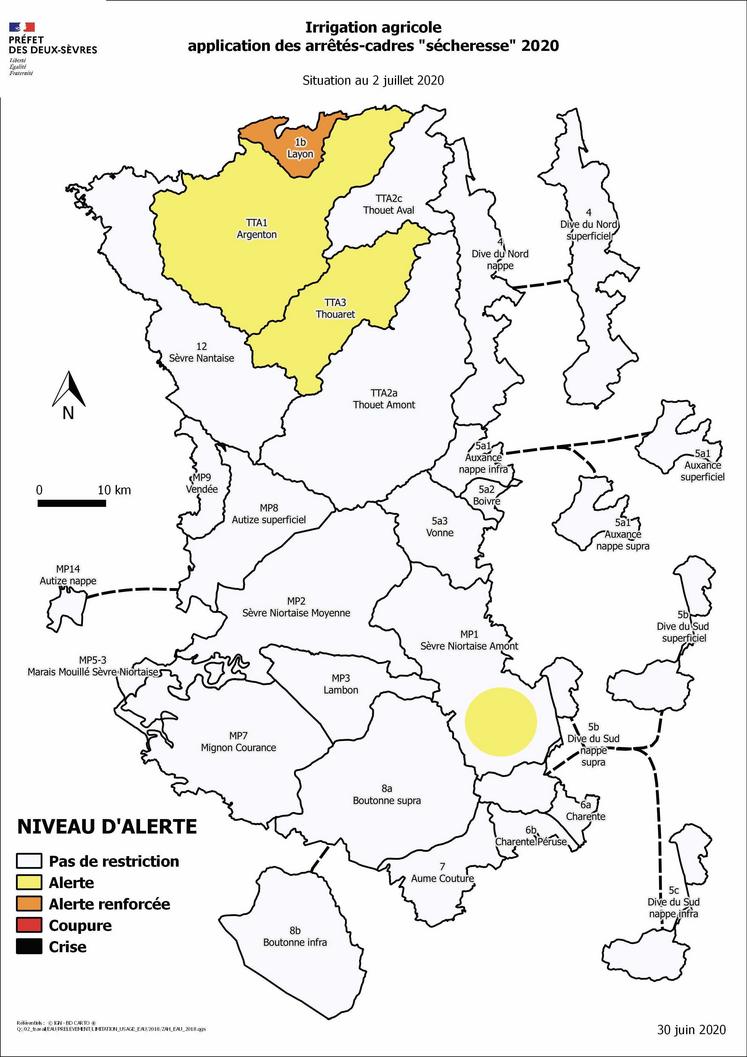 Cinq seuils réglementaires spécifiques à l’irrigation agricole ont été franchis. Ces franchissements nécessitent l’application de mesures de restriction concernant les sous-bassins de l'Argenton1 et du Thouaret2 à compter du jeudi 2 juillet 2020 à 8 heures, le sous-bassin du Layon3 à compter du jeudi 2 juillet 2020 à 10 heures et le sous-bassin de la Sèvre Niortaise4 amont à compter du lundi 6 juillet 2020 à 8h00.